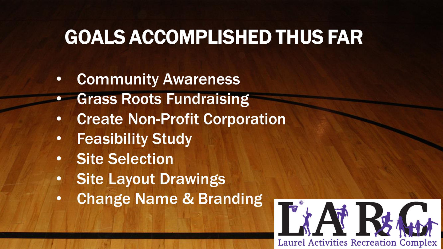 LARC will have 2-3 full-size basketball courts. This will allow for tournaments to be hosted in Laurel as well as room for other activities like craft fairs and trade shows.
